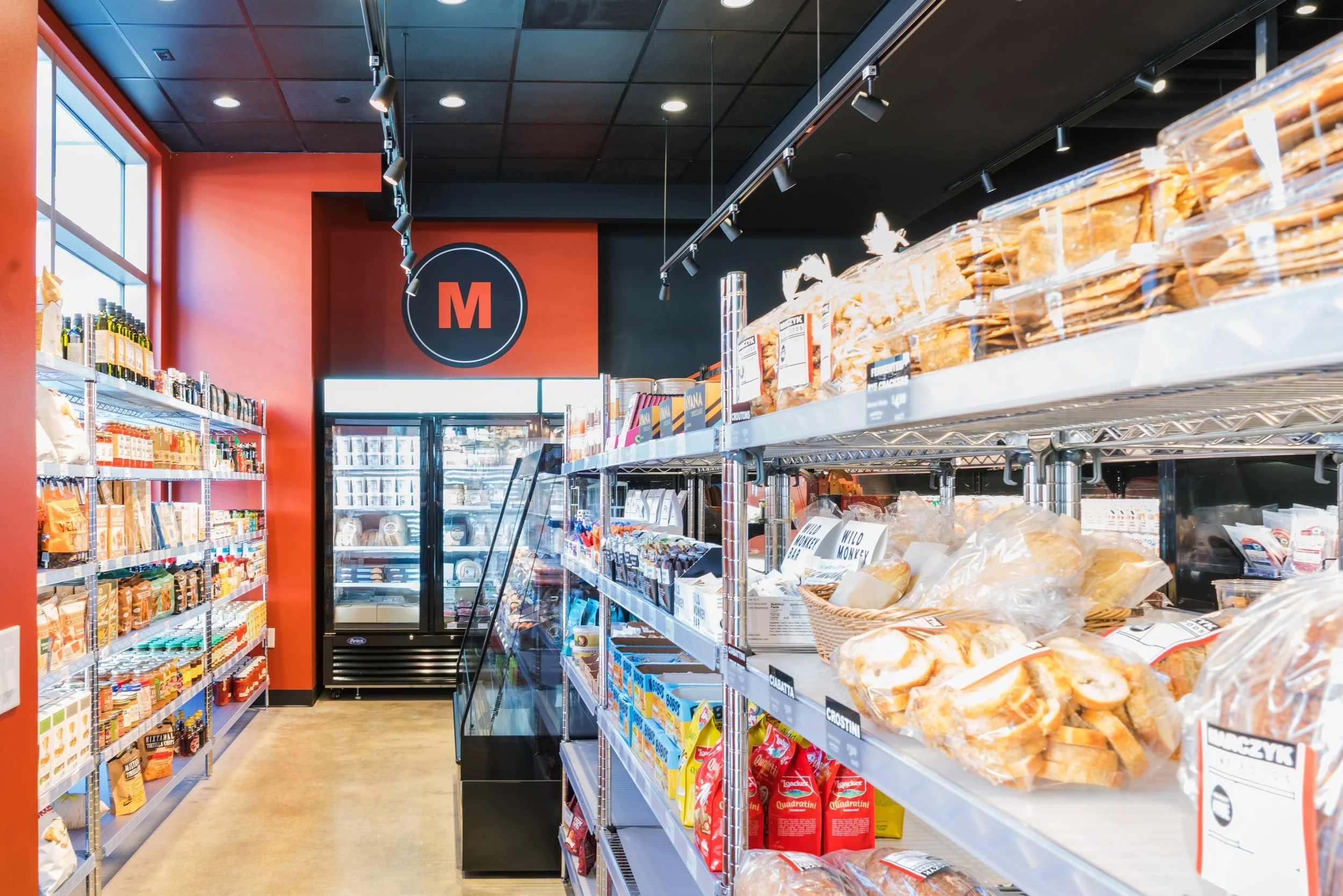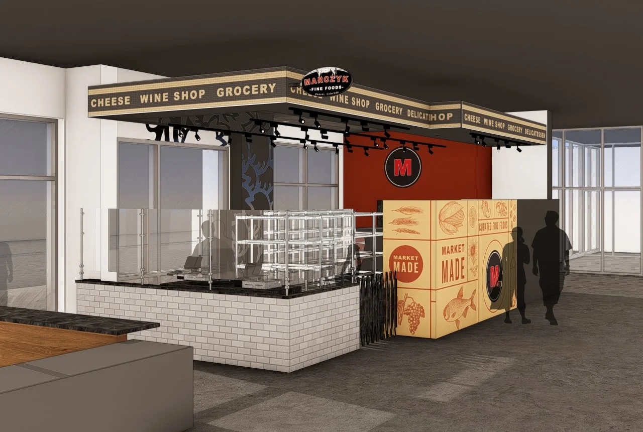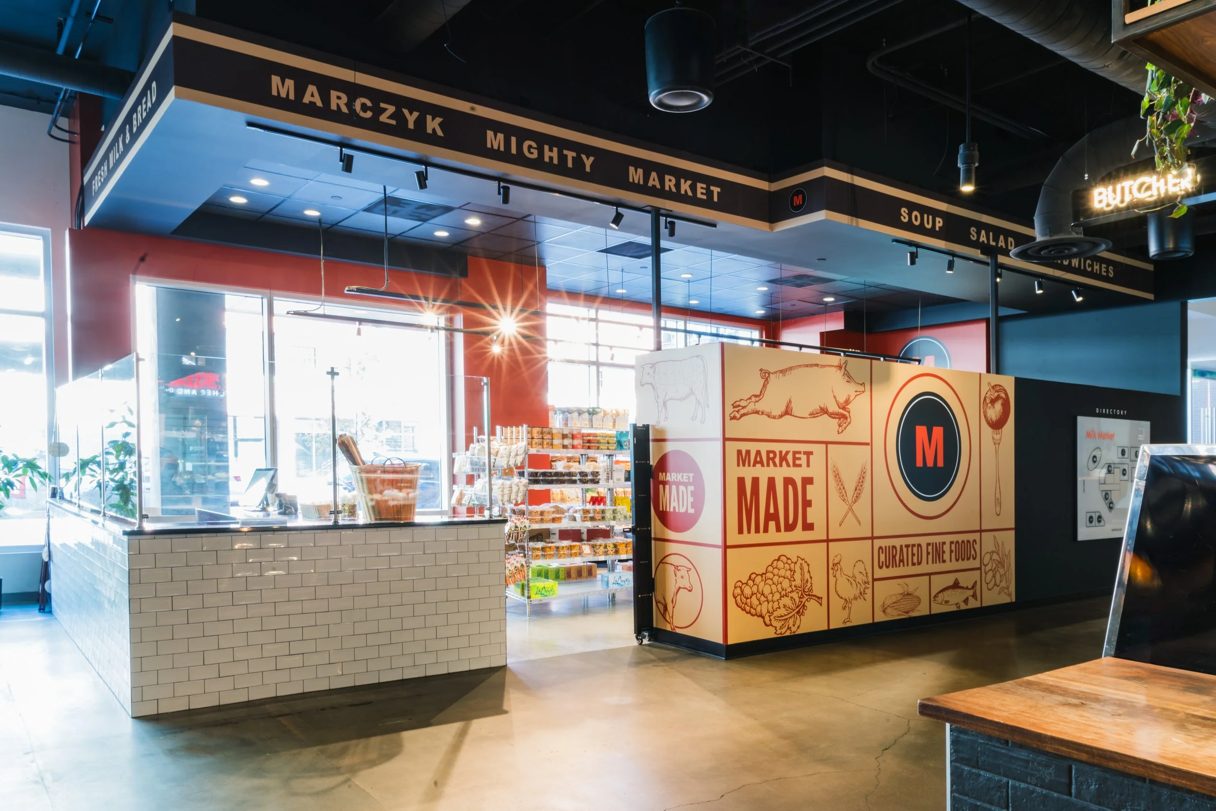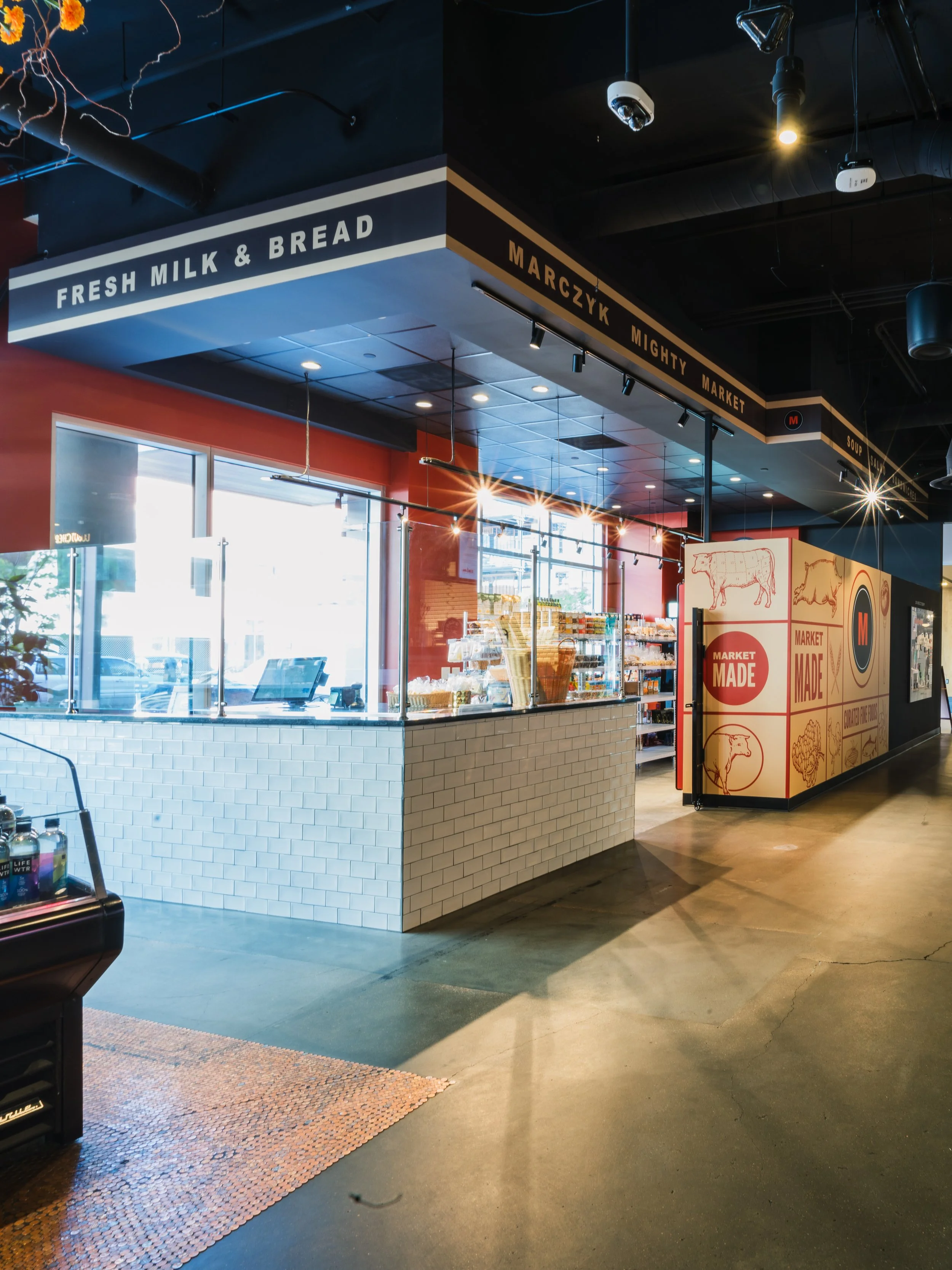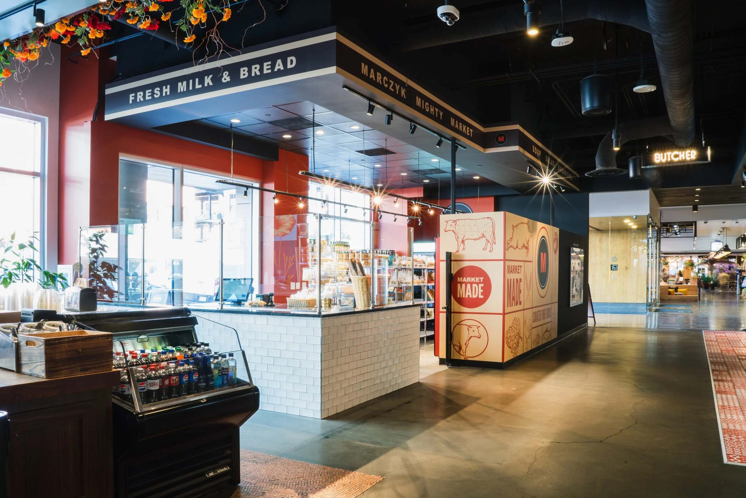 Food service and interior fit out of a Fine foods market in a food hall, downtown Denver.